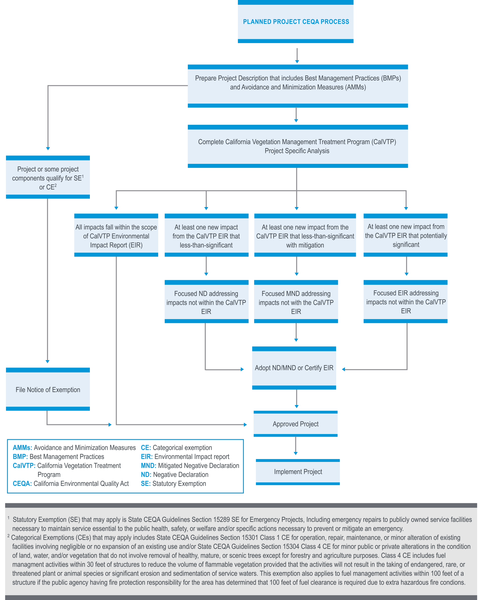 With documentation and permitting, the complexity of a project is often not based on size but rather location. With our focused effort on wildfire resilience and fuels management, we understand that this project may not be able to avoid sensitive resources and/or listed species. SWCA’s team is fully capable of providing rapid mobilization for tasks, adaptability throughout the dynamic process, and an increased efficiency with our diverse staff of scientists who have the technical capability and experience in consistently delivering compliant, legally defensible, and clearly written environmental documents and permit applications. If the need for permits is determined, SWCA will work with Butte County to develop project-specific permit tracking and schedules to obtain all permits in a timely manner. A more detailed description of SWCA’s environmental document or permit process follows.