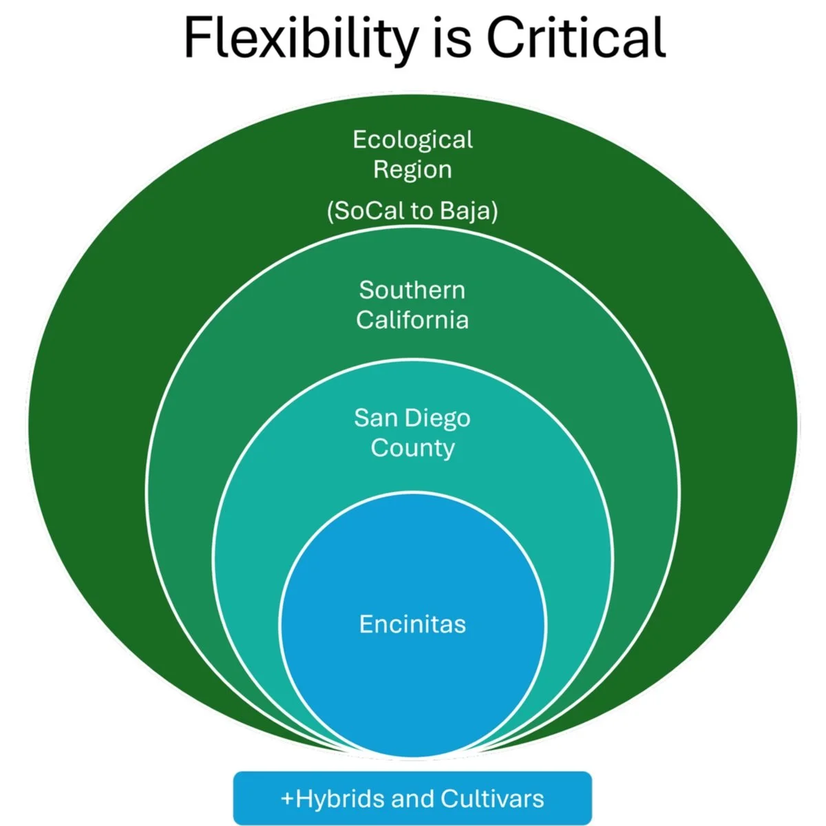 A native plant is a species that naturally occurs and has evolved in a specific region, ecosystem, or habitat over a long period of time, often thousands of years. These plants are adapted to the local climate, soil conditions, and the presence of other native species, including wildlife. The definition chosen by the City during the ordinance preparation is critical to enabling flexibility for the community and ultimate implementation success. The City will work through the pros and cons of various definitions with the City to identify what will work best for the ordinance goals. For example, the Commission for Environmental Cooperation places Encinitas within the Mediterranean California Level I Ecoregions, which spans from northern California to portions of northern Baja and is immediately adjacent to the North America Deserts Ecoregion. A definition of this scale maximizes flexibility for the program but does require additional consideration.