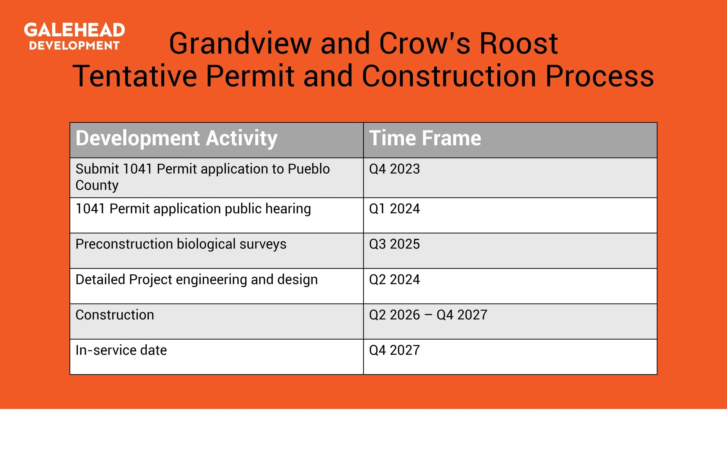 Galehead plans to submit 1041 Permit applications for the Grandview and Crow’s Roost Solar Projects (Projects) to Pueblo County in quarter (Q)4 of 2023. Galehead anticipates that public hearings for the Projects’ 1041 Permit applications would be held in Q1 of 2024. Preconstruction biological surveys for the Projects are planned for Q3 of 2025. Detailed engineering and design for the Projects is planned for Q2 of 2024. Construction of the Projects is planned to begin in Q2 of 2026 and be completed in Q4 of 2027. The in-service date for the Projects is planned for Q4 of 2027.
